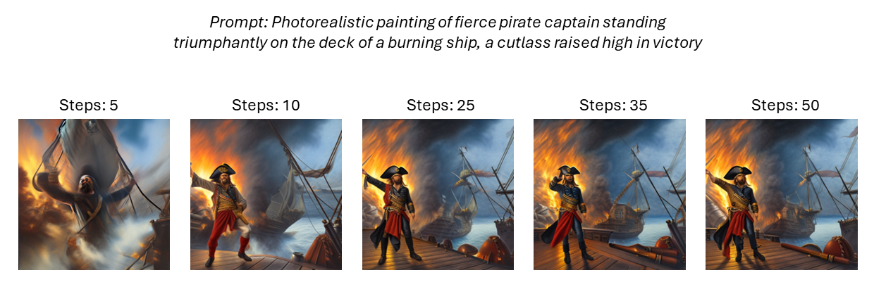 3. Steps: The steps parameter controls the number of denoising steps taken during the generation process. More steps will refine the image further. For quick tests, we recommend step values between 10 and 15. For more detailed results use a step value between 20 and 40.