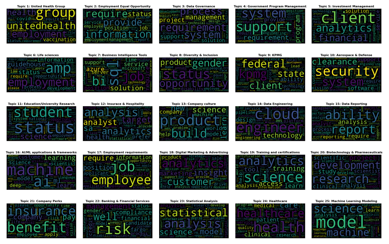 Using LDA we were able to uncover 25 topics within the job postings. Below are word clouds of the top 200 words for each of the topics.