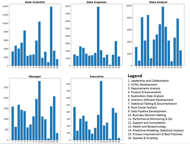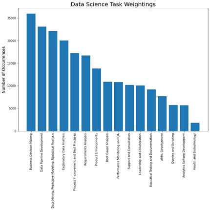 Using the model developed in the previous section, we extracted relevant data science tasks from each job description and tallied up the number of tasks belonging to each category.