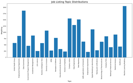 To better understand how each topic was distributed across the entire dataset, we added up all the topic weightings for each job description and produced the bar plot below.