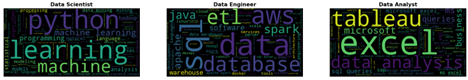 The next three figures show the most common skill terms used in job listings for three different data roles.