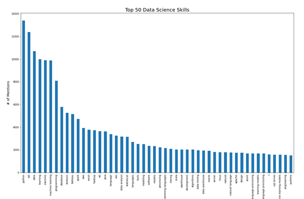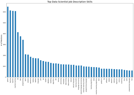 Unigram, bigram, and trigram tokens were produced from the skill phrases identified by model. These tokens are sequences of 1-3 words that are adjacent to each other in the text. We counted the number of job descriptions each token was mentioned in and produced a figure of the top 50 data science skill terms.